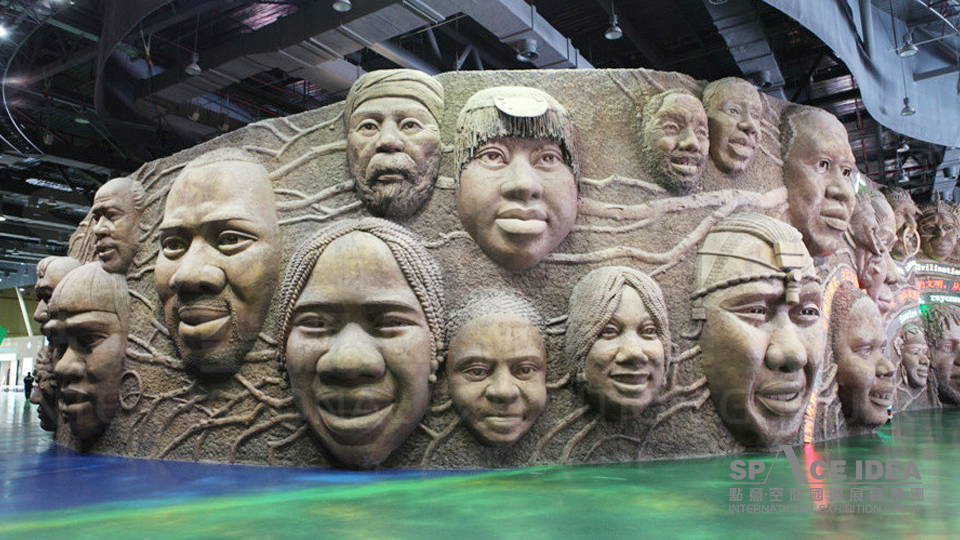非洲聯合館主題定位是人類文明的起源地。圍繞此主題,點意空間深度挖掘、充分運用富有強烈非洲特征的元素,營造非洲聯合館平實而溫馨的氛圍,完美詮釋古老而充滿生機的非洲大陸。以濃郁跳躍的色彩,呈現各國獨到的理念和獨特的展品,演繹多樣的非洲主題和深厚的文化底蘊,展示豐富多彩、魅力四射、和諧共處的整體非洲形象。融視覺、味覺、觸覺、聽覺、動感于一體,向全世界人民展示一個真實本色的非洲,讓更多的人了解、熱愛非洲,讓參觀者全方位地互動感受,在短時間內領略美麗神奇的非洲風采。