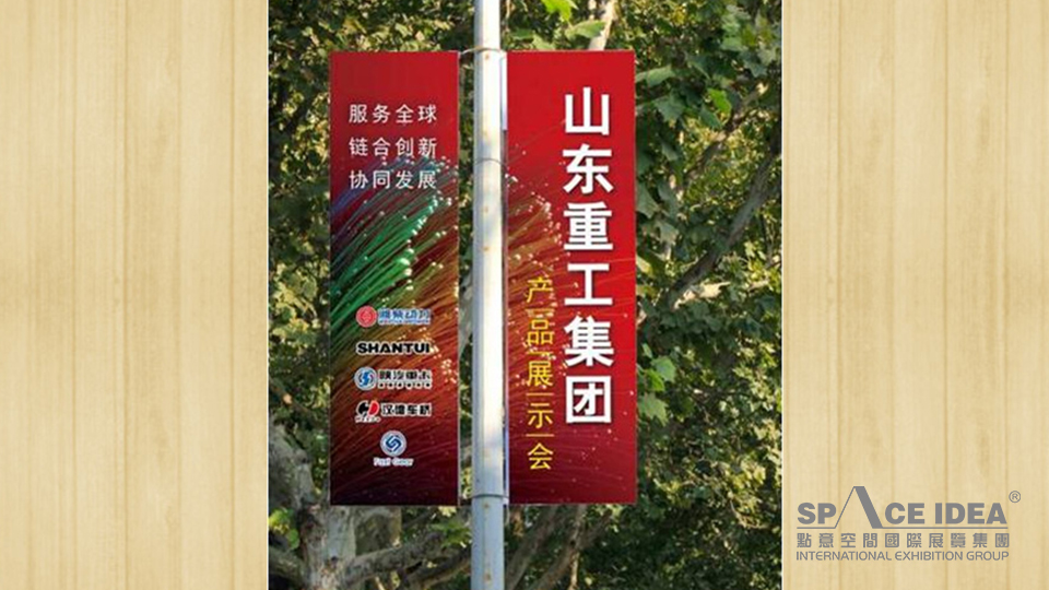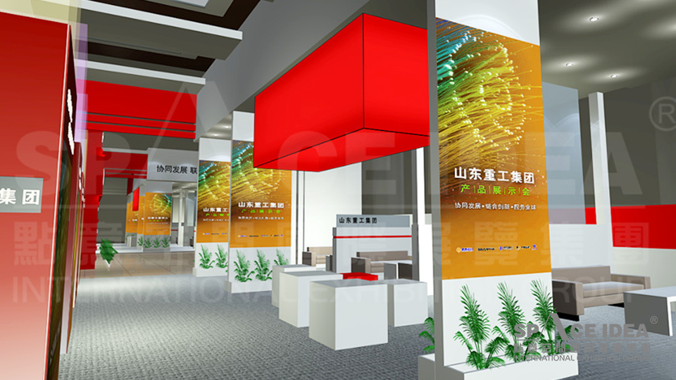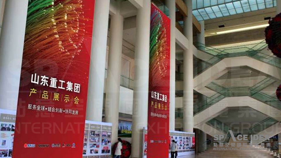 會場氣氛渲染是除了主展示區外的區域。通過對會場內外的展示布局,起到宣傳、指示作用。通過層層引導,持續不斷的視覺宣傳效果,把本次年會的氣氛烘托起來,展示出山東重工集團的實力,為本次產品展示會做好宣傳作用。