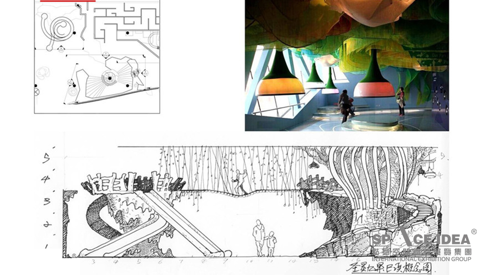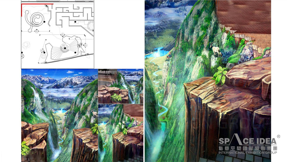 第四個展廳就充滿童趣了,仿佛叢林般的場景:巖洞中的星星點點、不經意的探頭熊叫,使驚魂山洞充滿神秘色彩;沿路而上進入叢林索橋,意想不到的滑梯體驗,帶來趣味無限。
