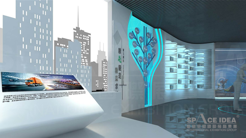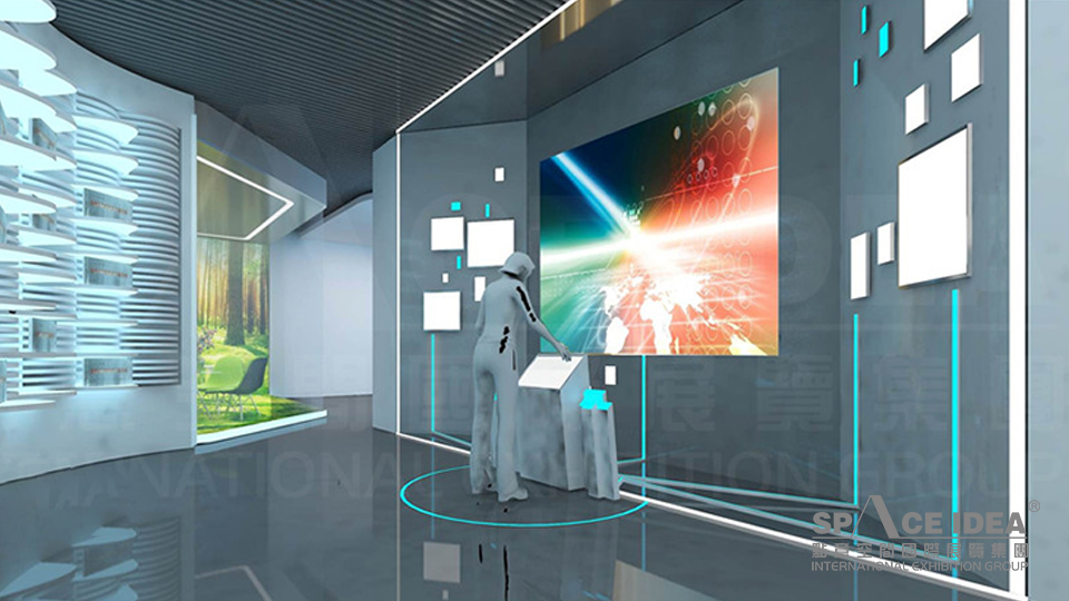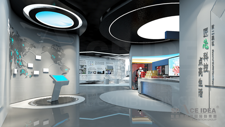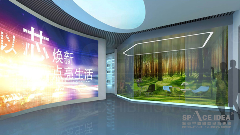 設計上以未來白為背景色,配合科技藍和生命綠鋪張整個展區,營造展示和諧舒適的展覽氛圍,色彩體系干凈、明亮,保證了色彩體系的完整性,又使整個展廳色彩飽滿,豐富活躍,暢快、大方,韻律感強。