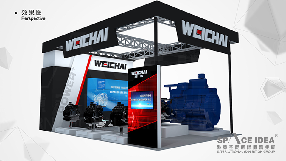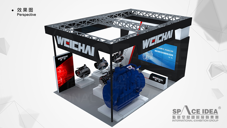 以濰柴LOGO中的黑色為主基調來進行環境的渲染,通過產品展示區進行展示,呈現出濰柴神秘又有科技含量的品牌形象,給人一種厚重的視覺沖擊力。大型LED顯示器,用視頻的形式展現濰柴內燃機的發展歷史及技術創新;設計過程中,采用三面開放的空間構造模式,內部功能合理明確,上面為鏤空設計,整體感覺大氣高端。