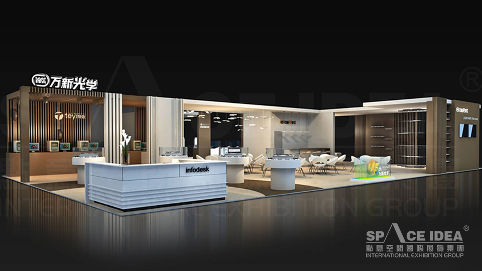 本案采用可塑性極強的淺色系材料,以暗金色和白色為主打,通過金屬質感和板材的厚重,來體現萬新光學國際眼鏡系列的經典時尚,不張揚卻極有內涵與品位。整個展臺采用三面通透的結構設計,風格簡單明了,中性的設計風格,充滿了現代時尚感。
