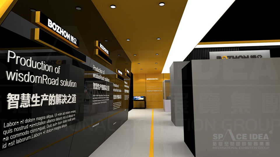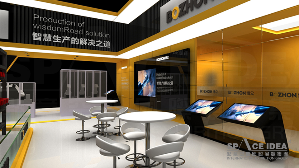 提取博眾品牌LOGO中的黃色及黑色來進行環境的渲染,營造半封閉空間來進行展示,通過場景的修飾、道具的展開,給人一種非常高端的感受。選擇現代感極強的高分子化合物與不銹鋼相結合的材料,體現博眾專注智能制造,以技術創新為核心的企業形象。休息區域桌椅均采用高分子化合物為主材料進行展具的排列,整體風格一致,又相互映襯。