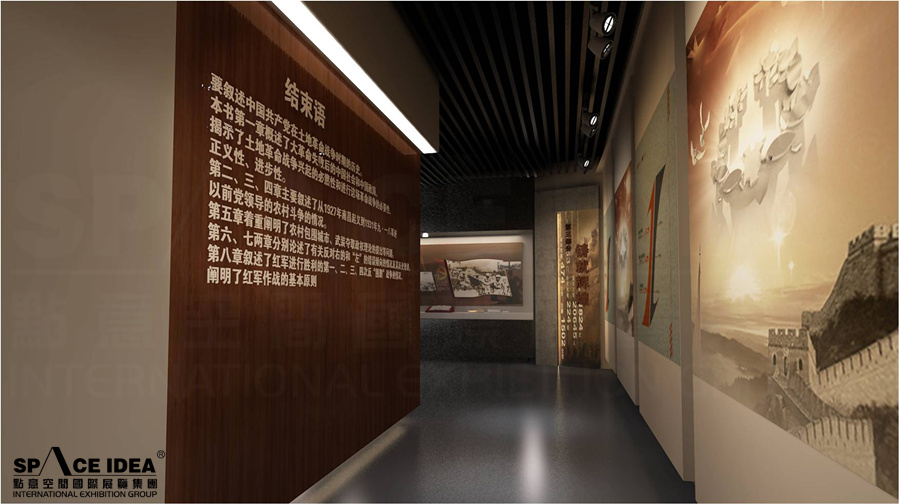 The design elements of blue sky and white clouds in the center of the exhibition hall originate from "creation of the sky", while the design elements in the left exhibition area originate from "creation of the land", which implies the pioneering spirit of older generation of the 2nd army and people to reclaim their homes and struggle hard. The right side of the exhibition wall takes Chinese ancient red color as the main tone, meaning that the two groups of military and civilian will create a better future for Jingzi Town (central sand table) under the guidance and care of the CPC central committee.